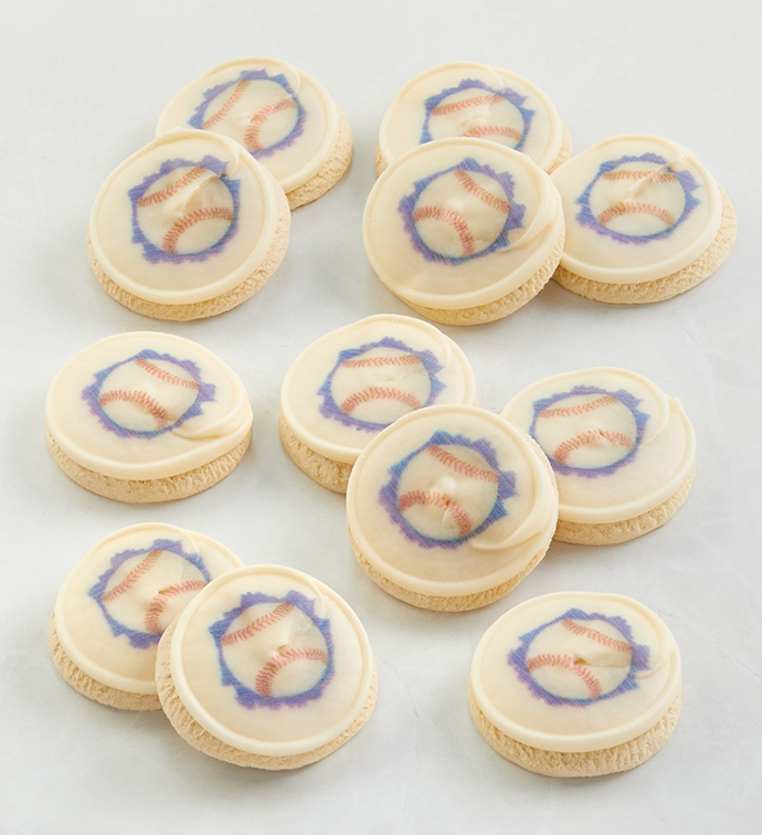 Go the distance with a winning gift made for baseball fans. Topped with a printed baseball on our famous buttercream frosting, a dozen iconic sugar cookies are ready to share with your home team. Whether it's for a benchmark date or just watching the game with friends, this sweet assortment will knock it out of the park. OU-D 12 pieces