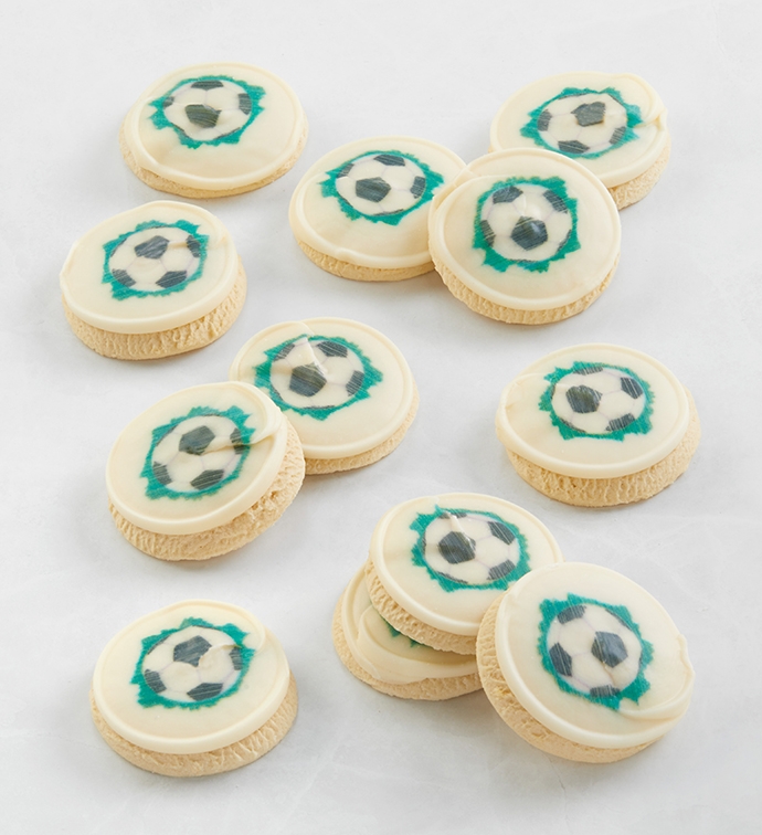 Score smiles by giving this fantastic gift to soccer lovers. Topped with a printed soccer ball on our legendary buttercream frosting, a dozen iconic sugar cookies are ready to enjoy while cheering on your team. No matter the occasion or who's winning, this delicious assortment of cookies will make the crowd go wild. OU-D 12 pieces
